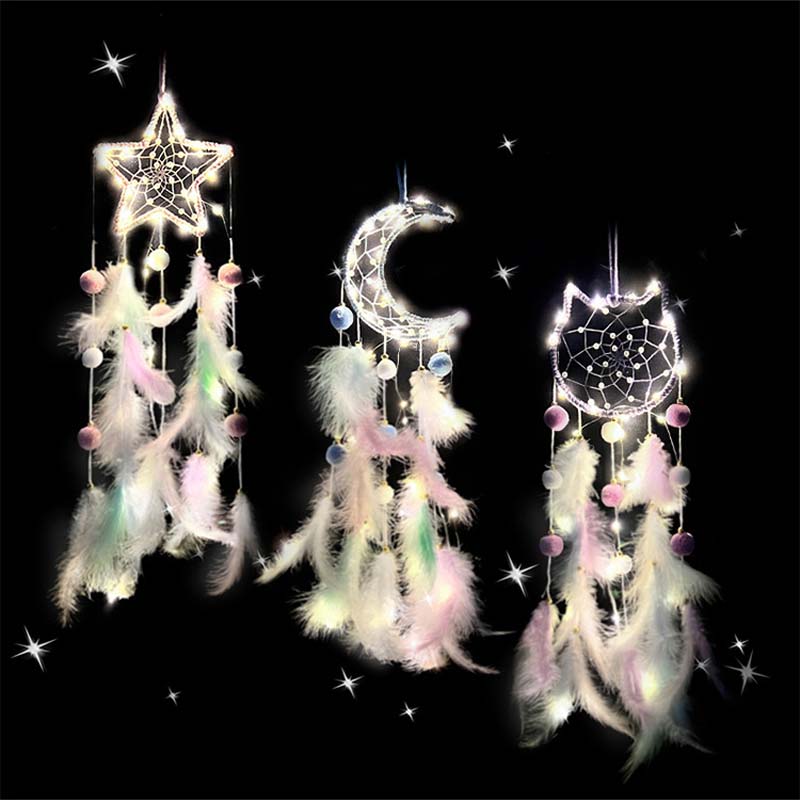 Ручная работа Кошка / Луна / Звезда Ловец Снов Подвесное украшение с легким пером ветряного колокольчика Волосяной комок Ветряной колокольчик Подвесной орнамент DIY Настенный подвесной орнамент