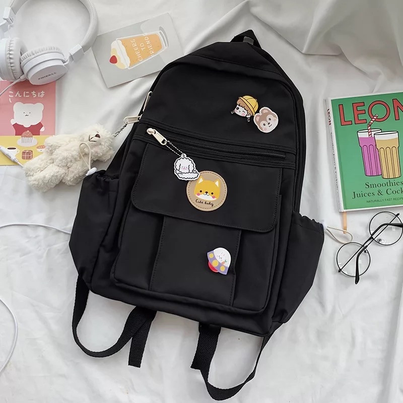 Рюкзак для девочки черный с брелком мишка и значками Rentenger(AV274)