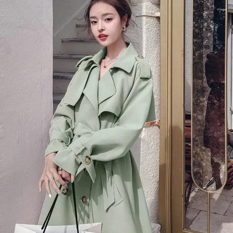 Women' Trench Coats Abrigo Mujer Pink Green Women' Coat Long Duster With Belt Spring Fall Fashion Temperament Korean Casual Jacket