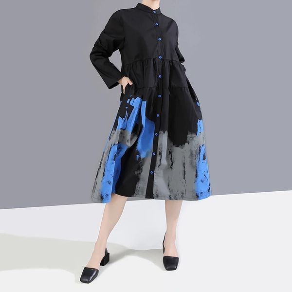 women black pattern printed long dress new stand collar long sleeve loose fit fashion tide spring autumn 2021, White