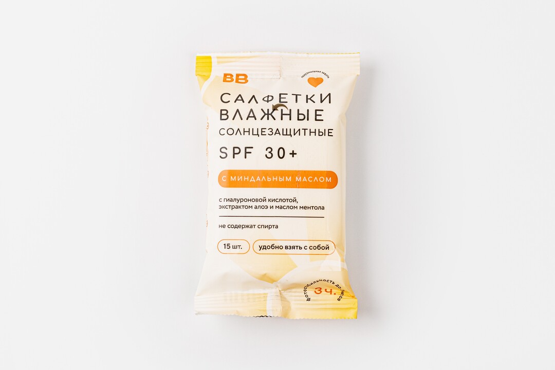 Салфетки влажные ВкусВилл солнцезащитные Spf 30+ с миндальным маслом 15 шт