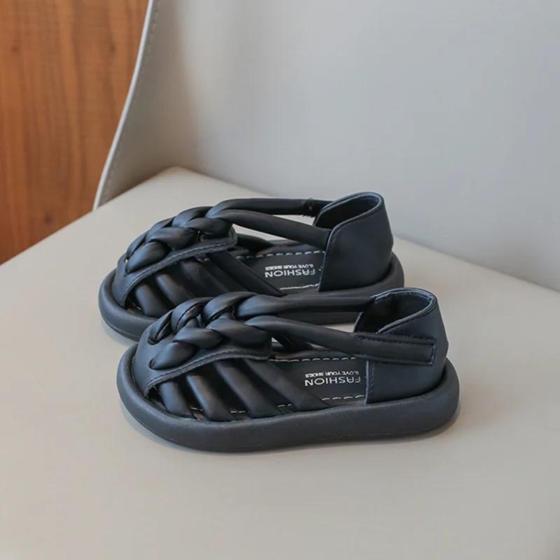 Сандалии для девочек, летние, однотонные, детские, повседневные, принцесса, плетеные, пляжные, модные, мягкие, детские, вырезанные, школьные сандалии 26 чёрный