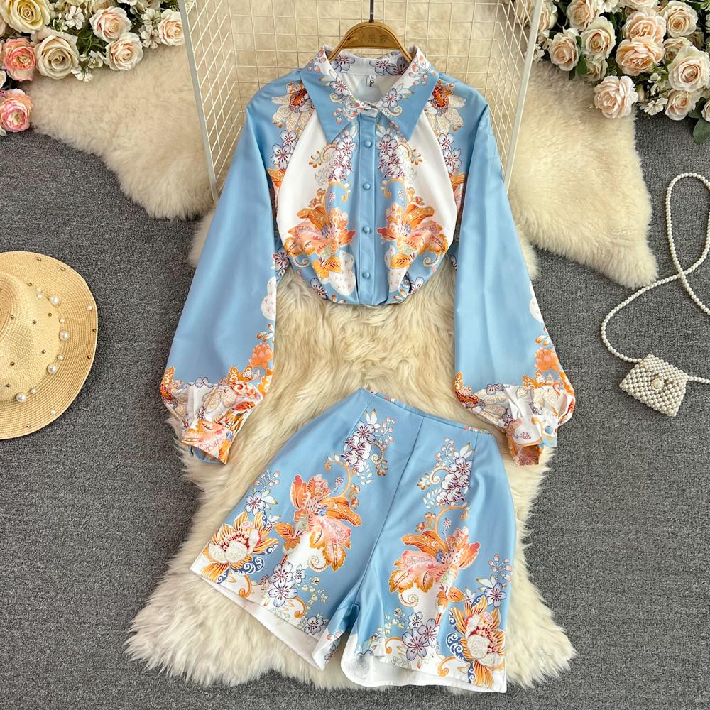 Высокое качество, летние женские модные комплекты брюк с цветочным принтом, однобортная рубашка с рукавами-фонариками, топы + шорты, костюм