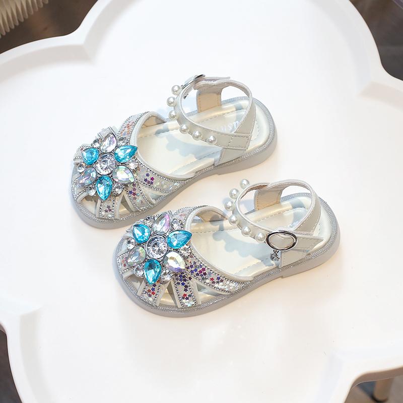 Сандалии для девочек с блестящими кристаллами и цветком, детские туфли принцессы на лето 2025, новая модная пляжная обувь для девочек, перфорированные, нескользящие, Инс 23 синий