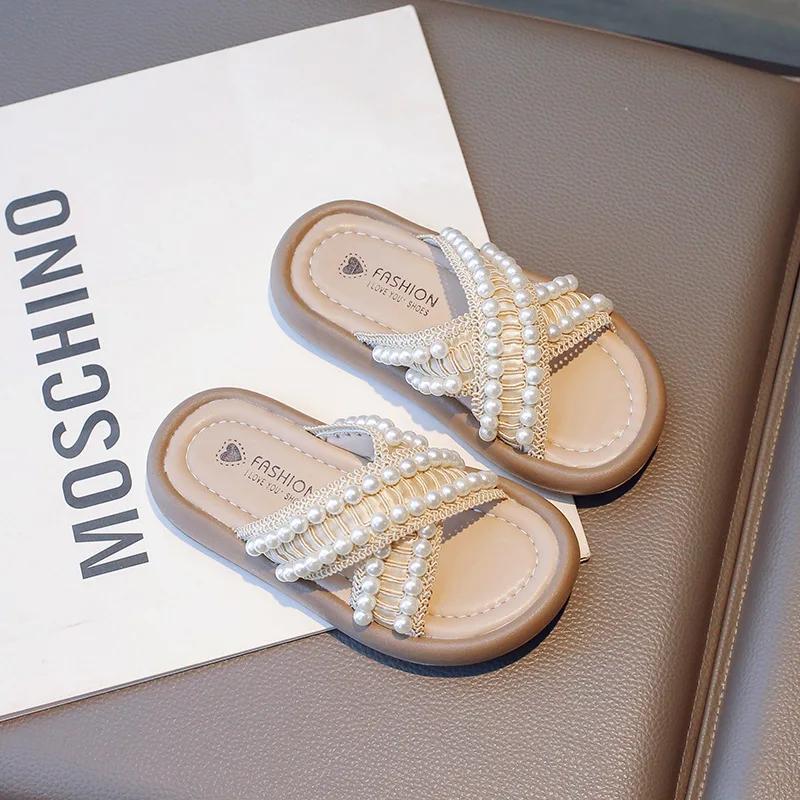Сандалии для девочек 2024 Лето Новые Детские Мягкая Подошва Шикарные Шлепанцы Кружево Жемчуг Пляжная Обувь для Отпуска Милая Принцесса Мода 29 хаки