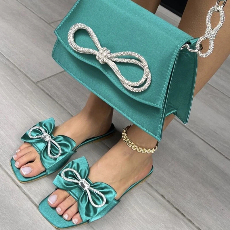 Сандалии стразы женские зеленые, роскошные модные туфли с шелковым бантом, элегантная простая пляжная обувь на резиновой подошве, лето 2022
