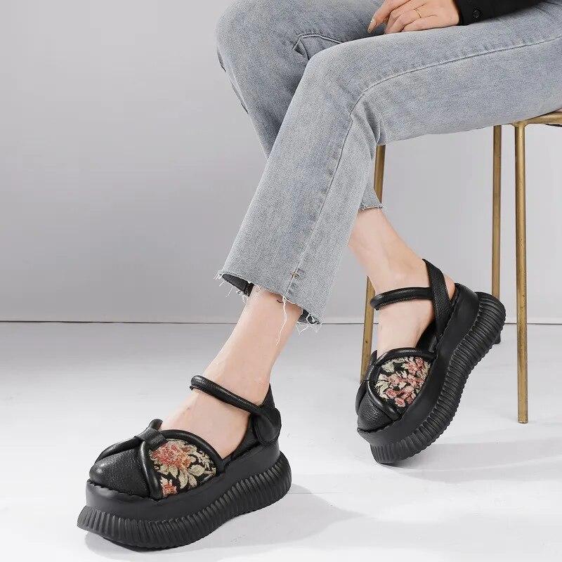 Сандалии Johnature на плоской платформе в этническом стиле, женская обувь в стиле ретро из натуральной кожи в стиле пэчворк, из хлопка и льна 34 чёрный