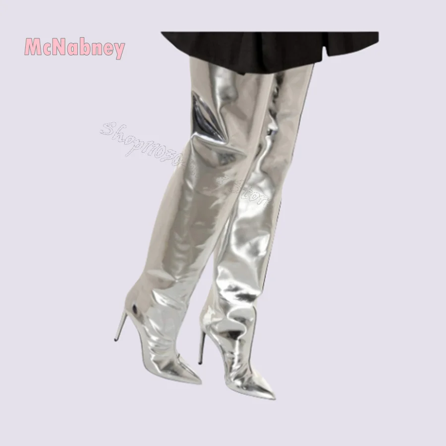 Сапоги выше колена из лакированной кожи с острым носком, Прямые сапоги на шпильке и молнии, женская обувь, новинка 2024