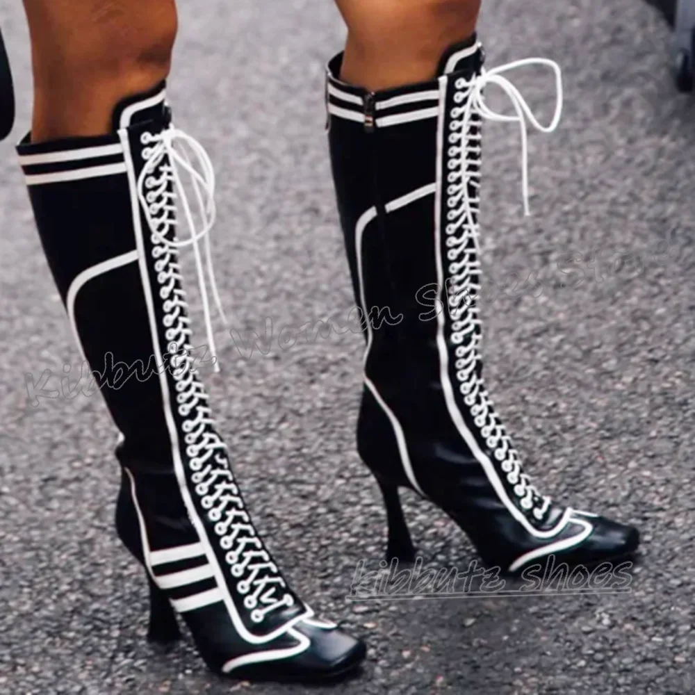 Сапоги до колена для шитья, модная роскошная элегантная лаконичная пикантная женская обувь, новейшая кожаная обувь на шнуровке в стиле пэчворк с квадратным носком, туфли на котенке