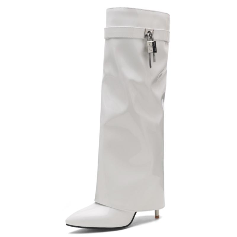 Сапоги до колена с отворотом Женская обувь Сексуальные Ключевые Высокие каблуки Белые Черные Вестерн Сапоги Женские 2024 Новые Тренды Вечерняя обувь 39 белый