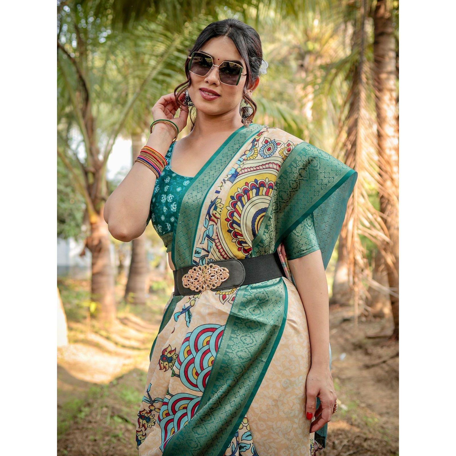 Сари из чистого шелка с цифровым принтом, излучающее королевское очарование благодаря богатому паллу и замысловатой парчовой блузке
