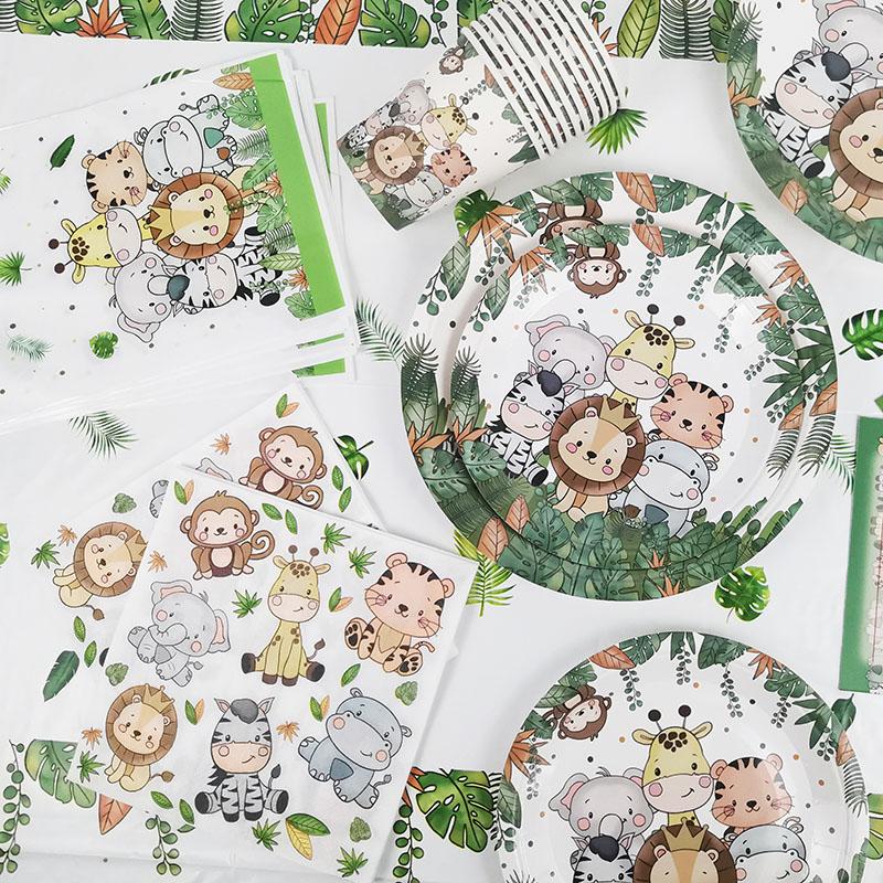 Сафари в джунглях День рождения Набор посуды Животные Воздушные шары Гирлянда Пальмовые листья Баннер Скатерть Детский день рождения Детский душ