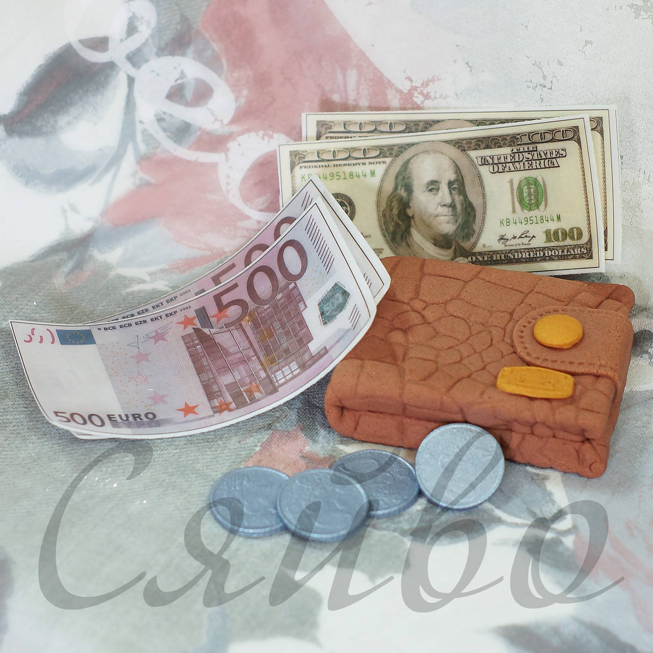 В наборе объёмный мужской кошелёк (портмоне), купюры долларов и евро, монетки евро. Изображение купюр нанесено на мастику с помощью вафельных картинок.