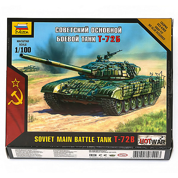 Чтобы собрать модель Zvezda «Советский основной боевой танк Т-72Б» не понадобится клей. Элементы надежно скрепляются между собой. Каждая деталь легко и без повреждений отсоединяется от литника. Танк можно раскрасить по цветам из инструкции. Кроме того, у модели подвижная башня.