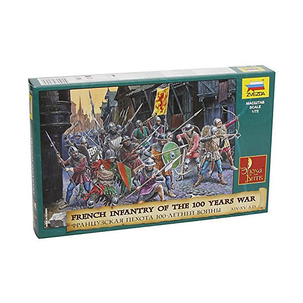 Модель для сборки Zvezda «Французская пехота. 100-летняя война» детально изображает военно-исторические миниатюры. Каждый элемент легко и без повреждений отсоединяется от литника. Фигуры можно раскрасить по цветам из инструкции.