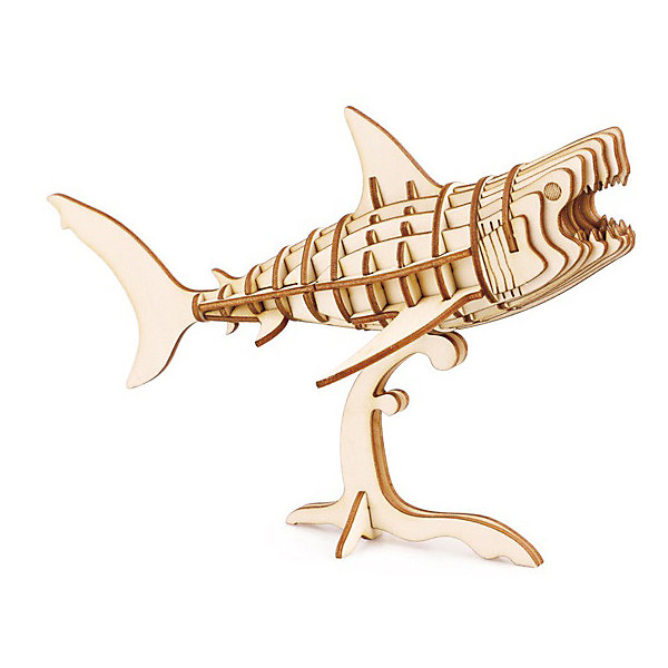 Из деталей 3Д пазла получается фигура акулы на подставке. Детали уже подготовлены, соединение происходит паз в паз. Клей не требуется.