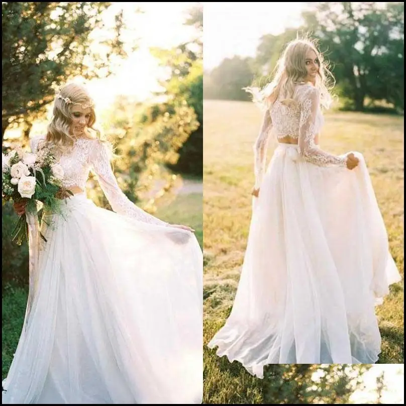 Свадебные платья в стиле ампир 2022, вечерние элегантные стильные платья из 2 предметов, кружевной лиф с длинным рукавом, шифоновая юбка, сваде...