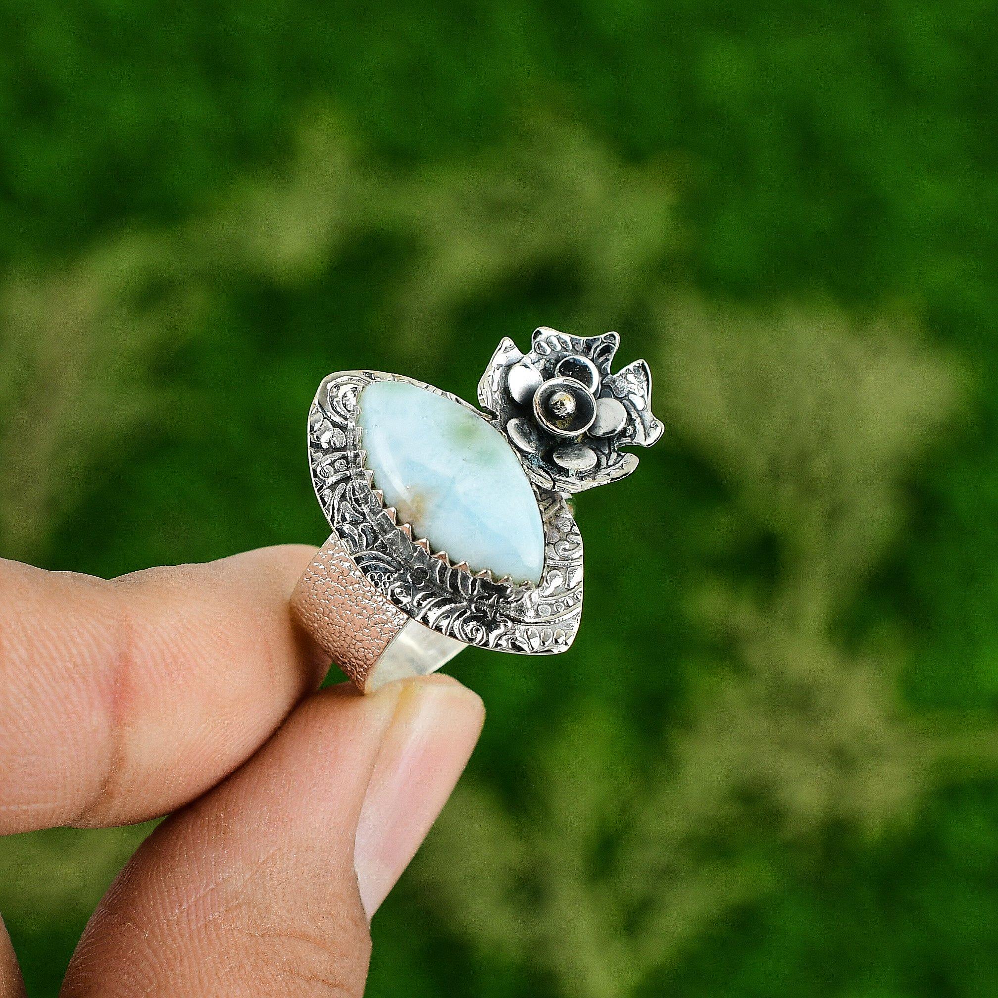 Свадебный подарок для нее Серебро 925 пробы Натуральный ларимар Кольцо-цветок с несколькими камнями Размер 8 8