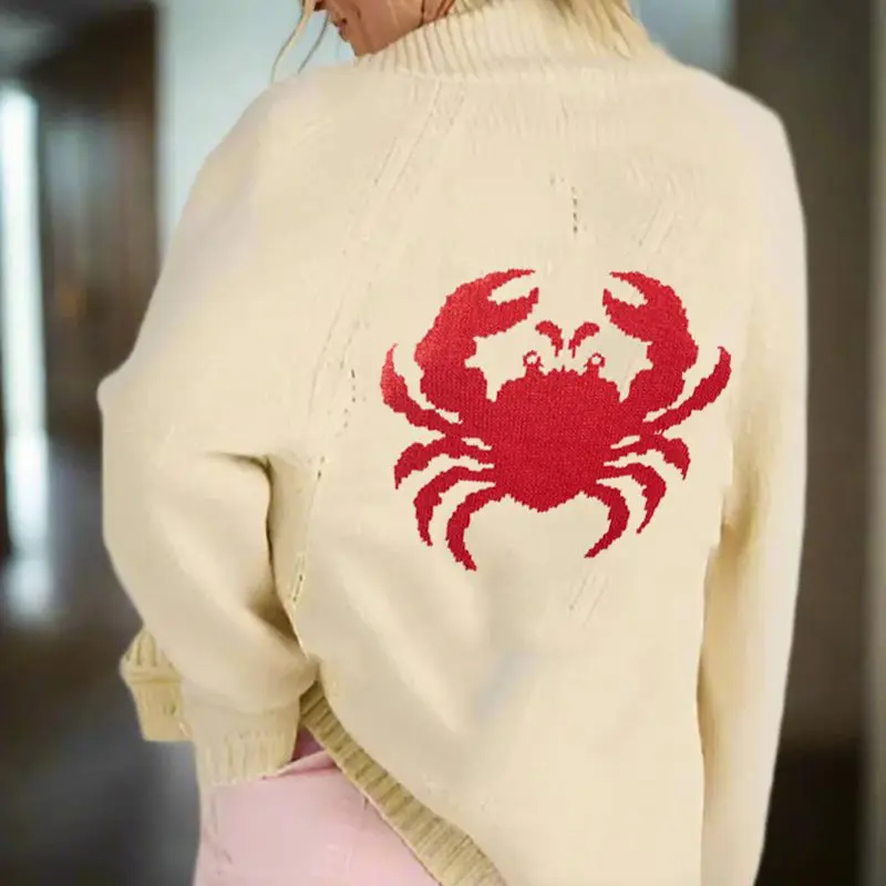 2025 женский осенне-осенний Y2K свободный крой ретро-свитер кардиган с длинным рукавом на пуговицах эстетический трикотажный костюм с крабовым принтом пальто с карманом