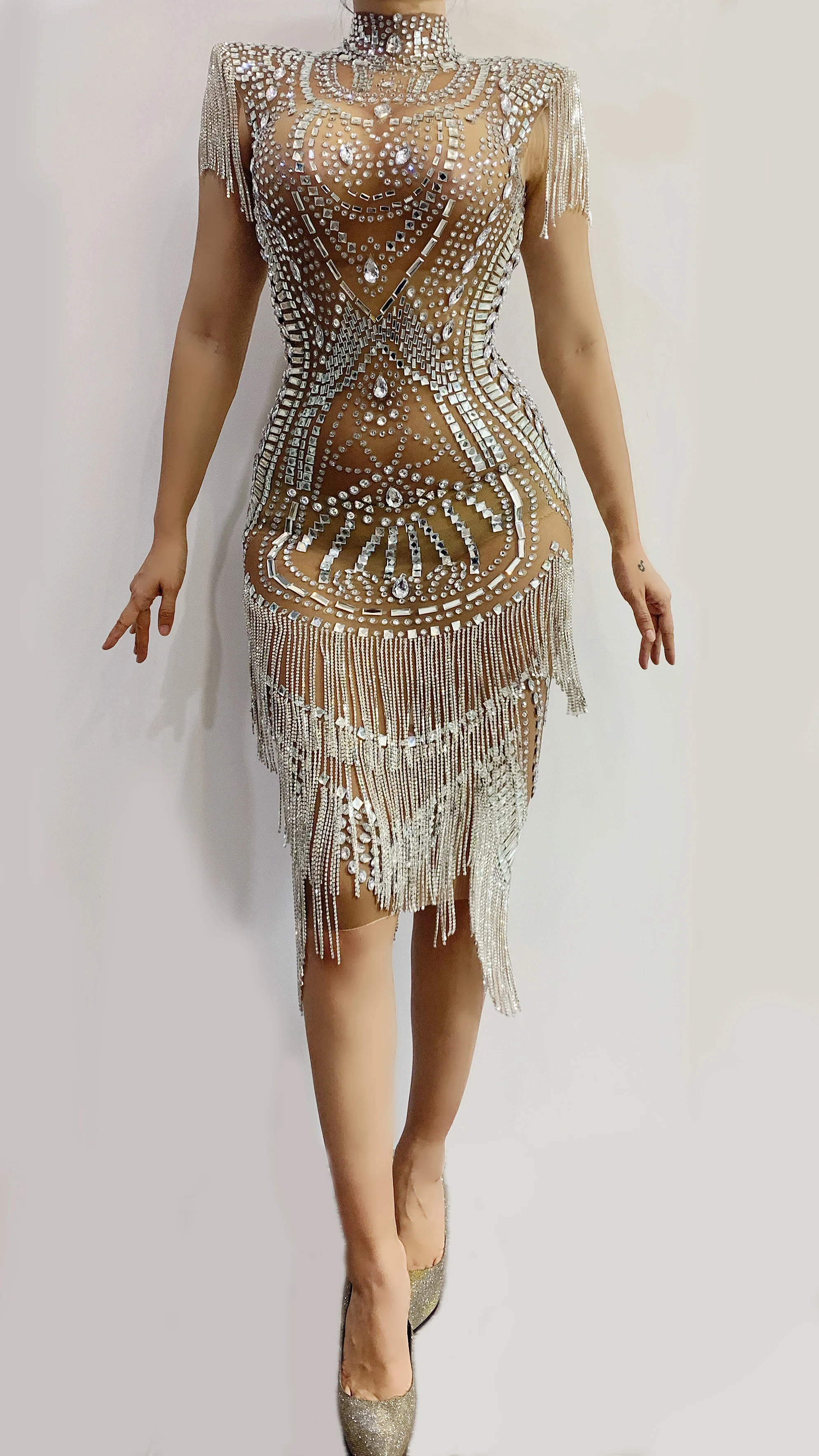 Сверкающие Серебряные Камни бахрома сетка день рождения Прозрачная Сексуальная цепочка наряд женское певец вечернее Прозрачное платье
