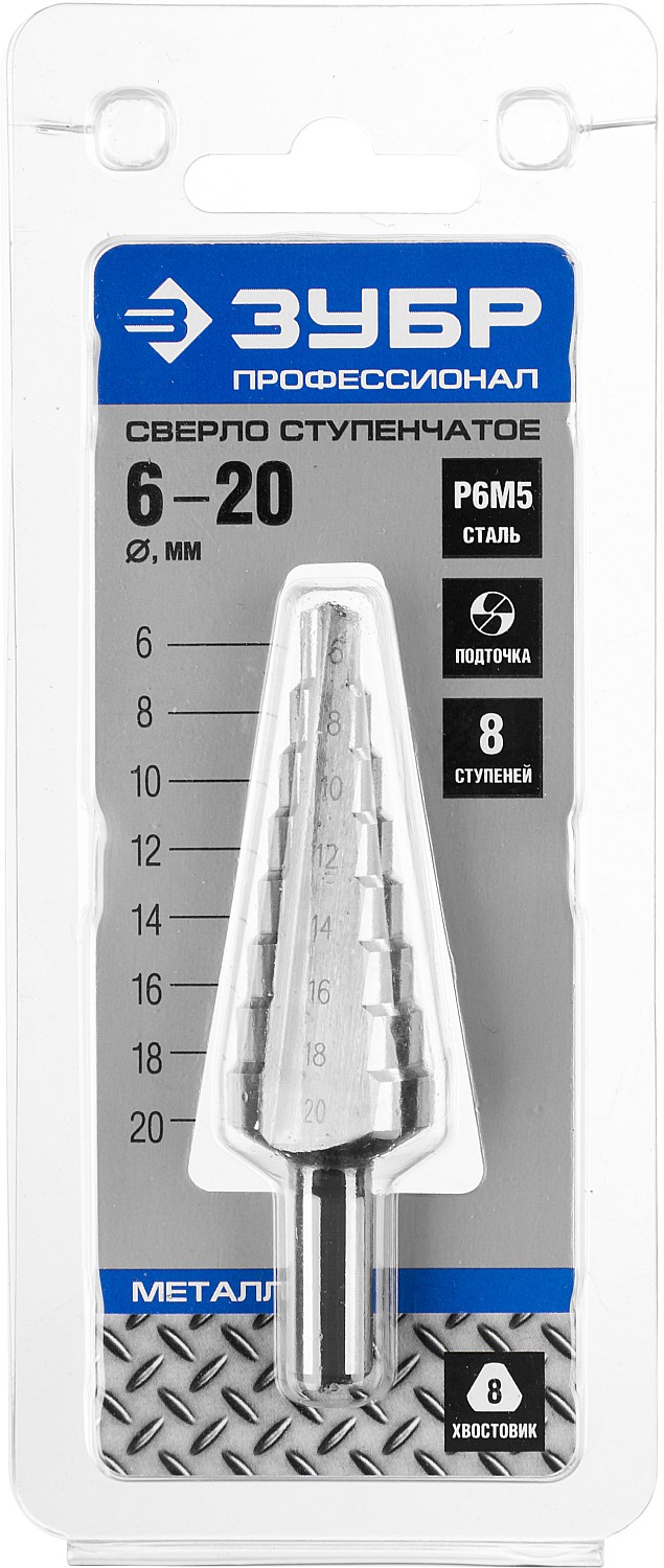 Сверло ступенчатое, ⌀ 6-20 мм, сталь Р6М5, по металлу, ЗУБР, 1 шт. (29670-6-20-8_z01)