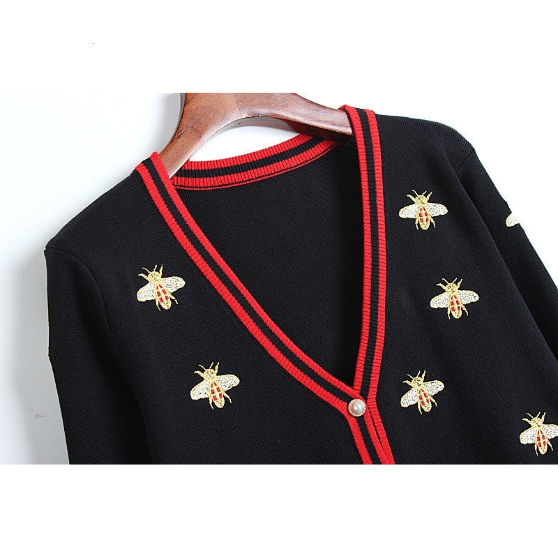 Abelha Bordado Cardigan Malha Feminina Primavera Outono Nova Europa Amrica Blusas Soltas Tamanho Grande Fino Com Decote Em Manga 8WRE M72G, Black