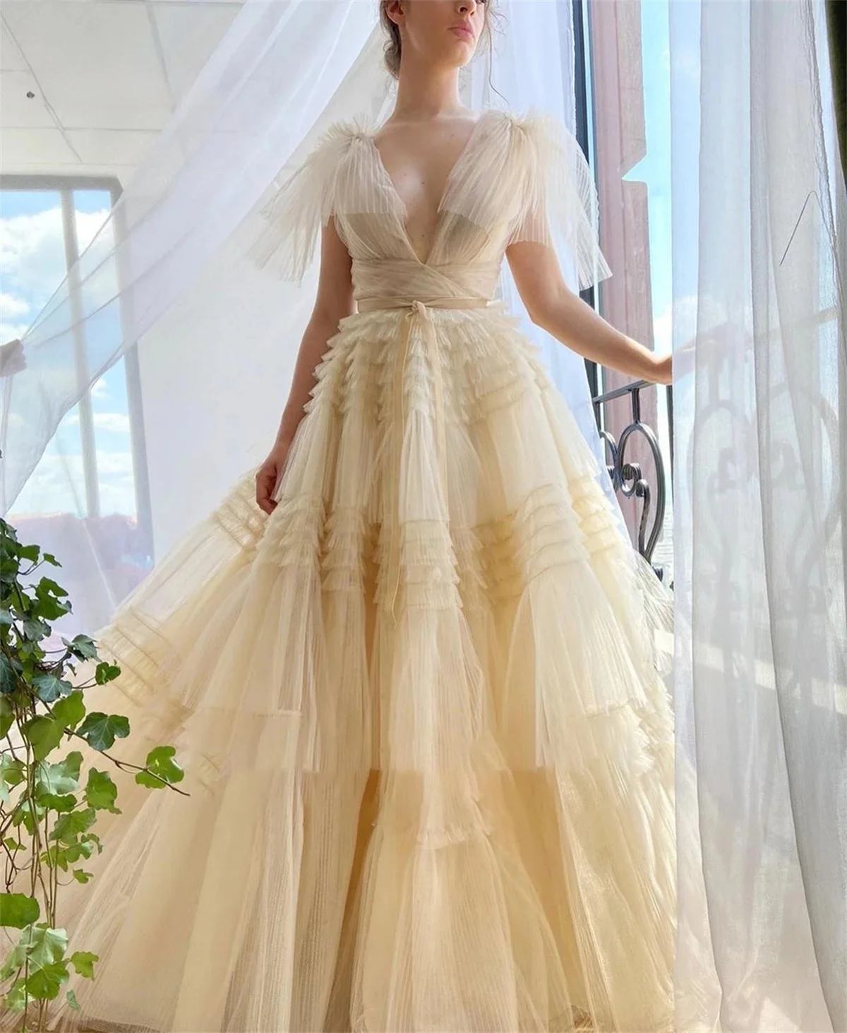Светильник-желтые вечерние платья в несколько рядов с V-образным вырезом без рукавов с лентами в стиле знаменитостей платья принцессы прозр...
