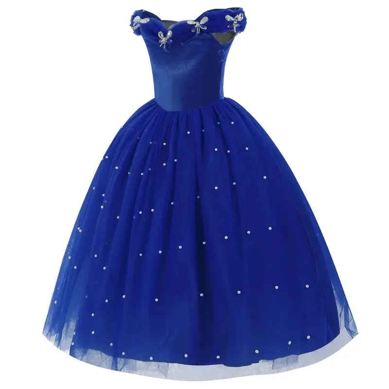 Светлое темно-синее праздничное платье для девочек, тюлевое бальное платье с открытыми плечами, детское платье Золушки для косплея, сказочное платье на день рождения
