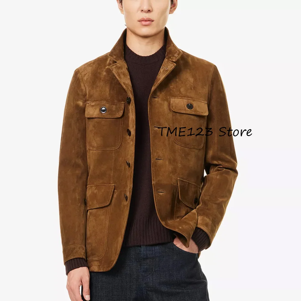 Замшевое мужское пальто, повседневный модный пиджак, куртки с четырьмя карманами на пуговицах, однобортный стильный мужской пиджак с лацканами, пиджак