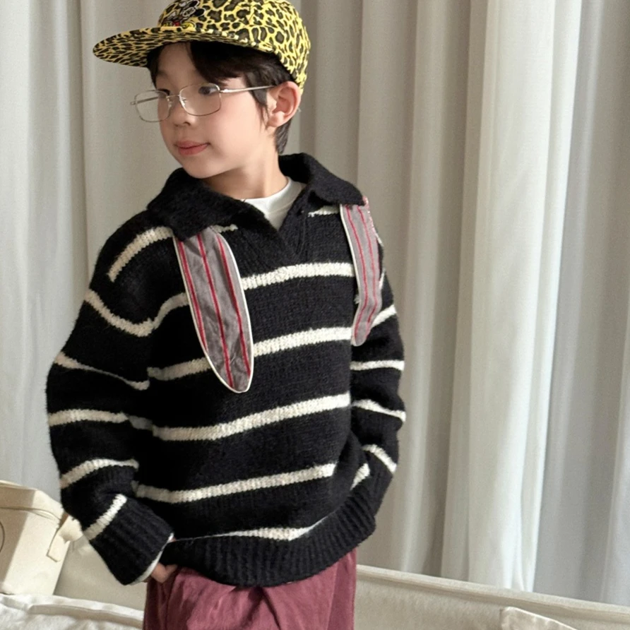 Свитер, осень 2024, новая детская одежда, корейский стиль, модная вязаная одежда в полоску с лацканами для мальчиков и девочек, повседневная, простая, универсальная