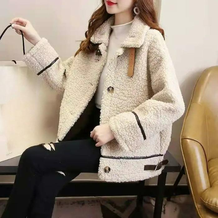 Свободный Осенне-зимний Универсальный Толстый Меховой Цельный Плюшевый Теплый Топ Пальто из Овечьей Шерсти Женский Длинный Рукав S бежевый