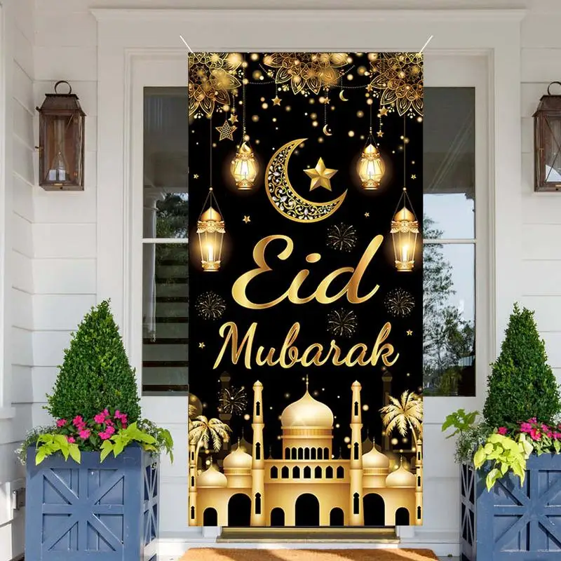 Сделай Сам, ИД, крыльцо для баннера, ИД, надпись, черная золотая дверь, подвесной знак, баннер, карем, мечеть, Передняя фотография, флаг, деталь