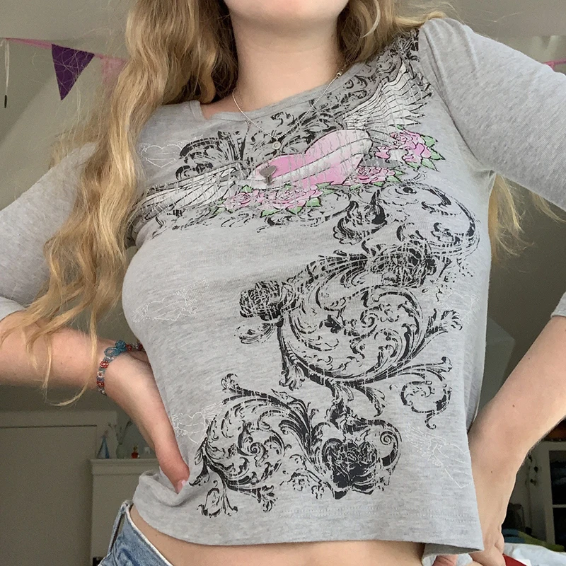 Women Retro Floral T-Shirt Long Sleeve Round Neck Club Party Street Casual Fall Blouse Streetwear