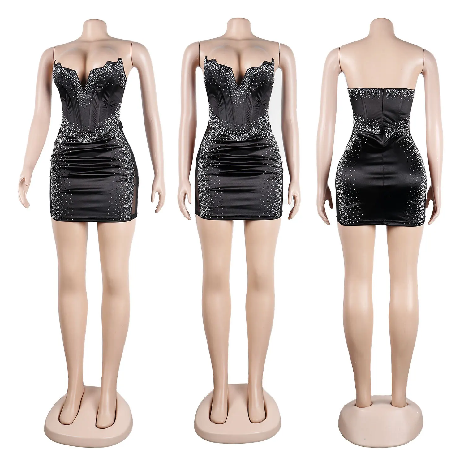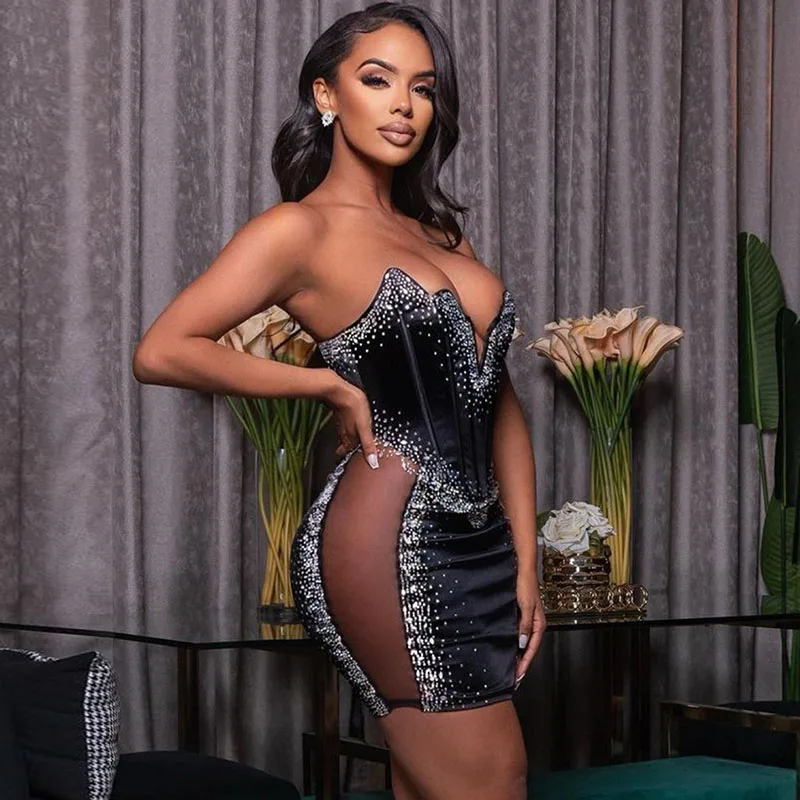 Сексуальное Сетчатое женское Короткое платье-корсет для выпускного вечера с V-образным вырезом, прозрачная одежда для ночного клуба, женское облегающее вечернее мини-платье со стразами