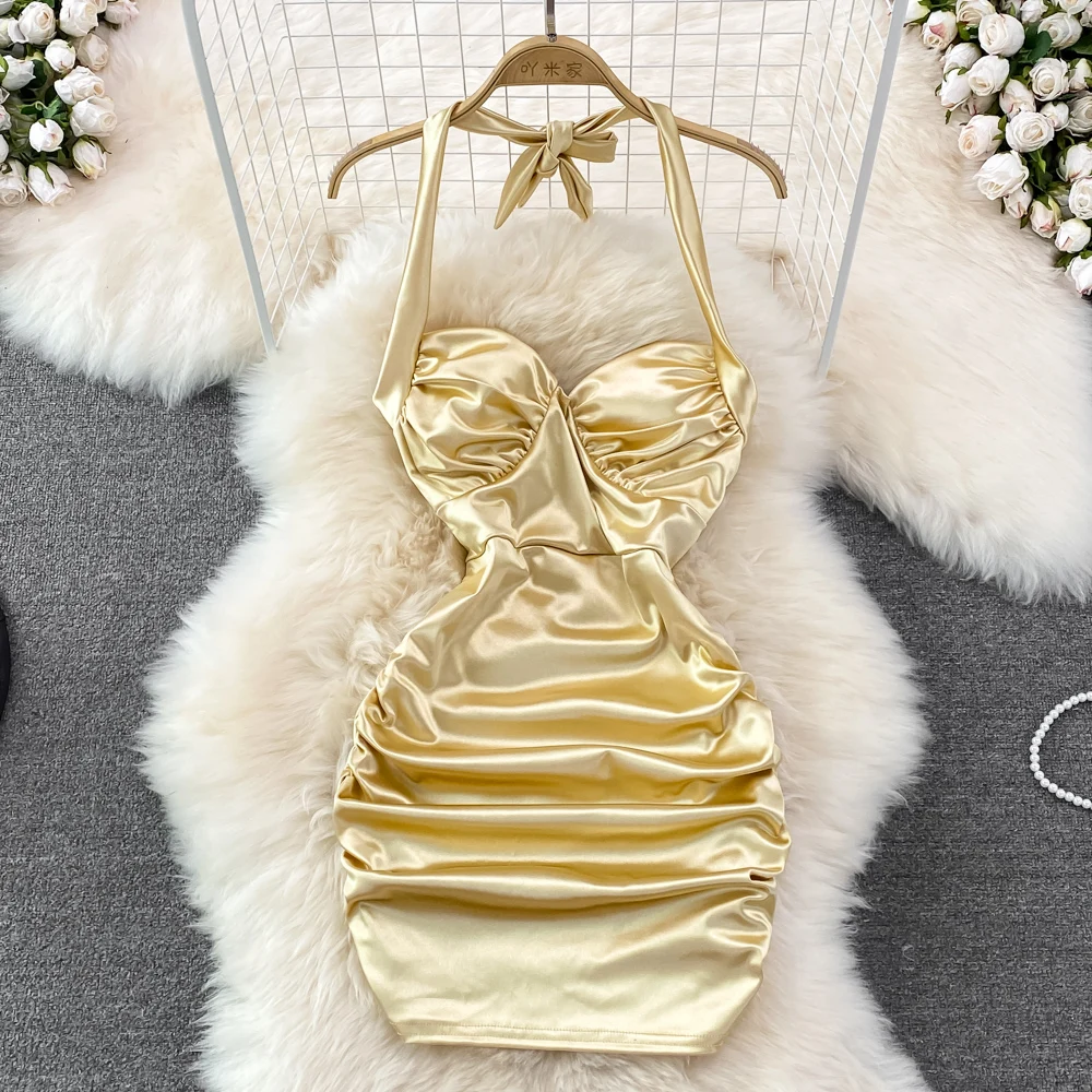 Сексуальное атласное облегающее платье с лямкой на шее, с рюшами, пикантные вечерние Клубные платья без рукавов с открытыми плечами, винтаж...
