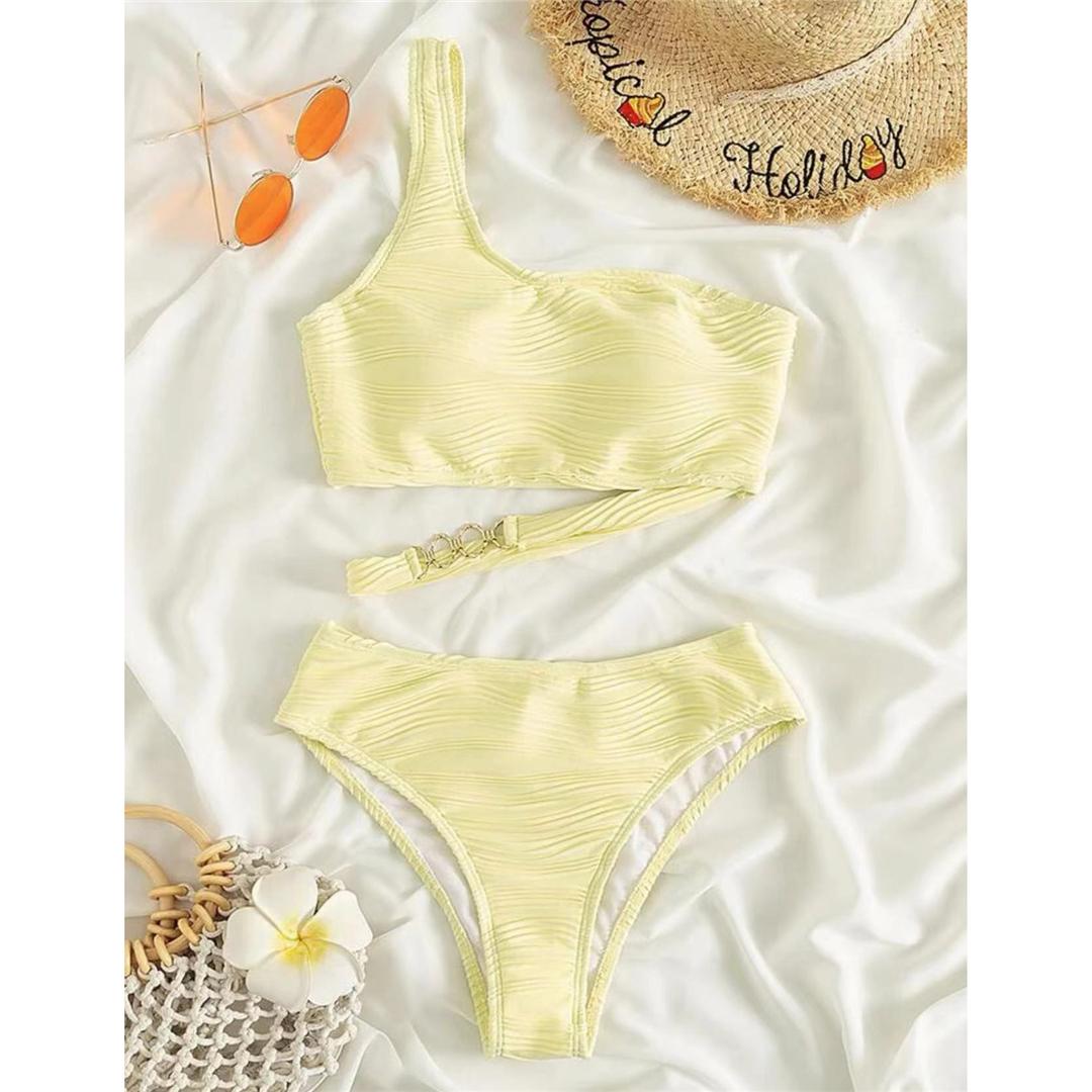 Сексуальное бикини на одно плечо с морщинистым металлическим кольцом, женские купальники, женский купальник, комплект бикини из двух частей, купальный костюм для плавания L светло-желтого