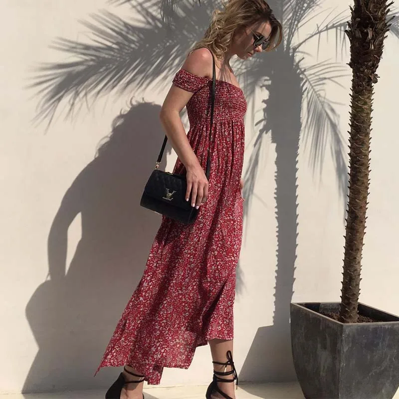 Сексуальное длинное пляжное платье с открытой спиной и цветочным принтом, с открытыми плечами, с высоким разрезом, плиссированное платье-ту...