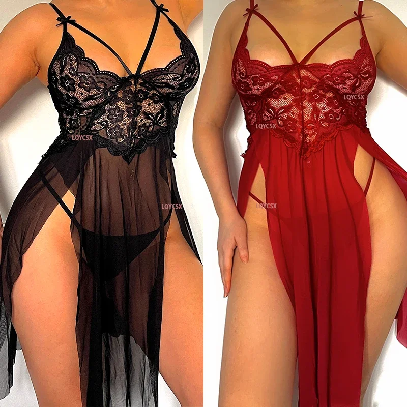 Сексуальное женское белье, женские пижамные комплекты, кружевное прозрачное соблазнительное платье для сна, сексуальная одежда, женское ночное нижнее белье, эротическая ночная рубашка с разрезом