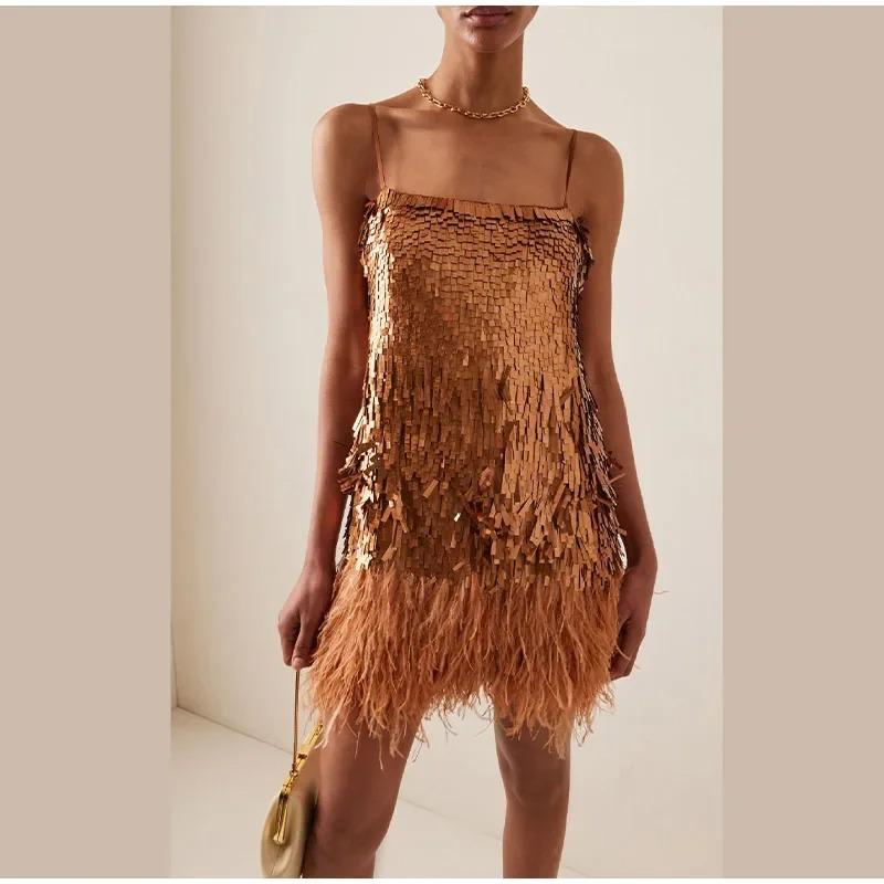 Сексуальное женское вечернее платье с пайетками и перьями, танцевальное клубное платье без рукавов, женское платье-комбинация 2024 года, летнее модное блестящее платье-трапеция на бретелях S жёлтый