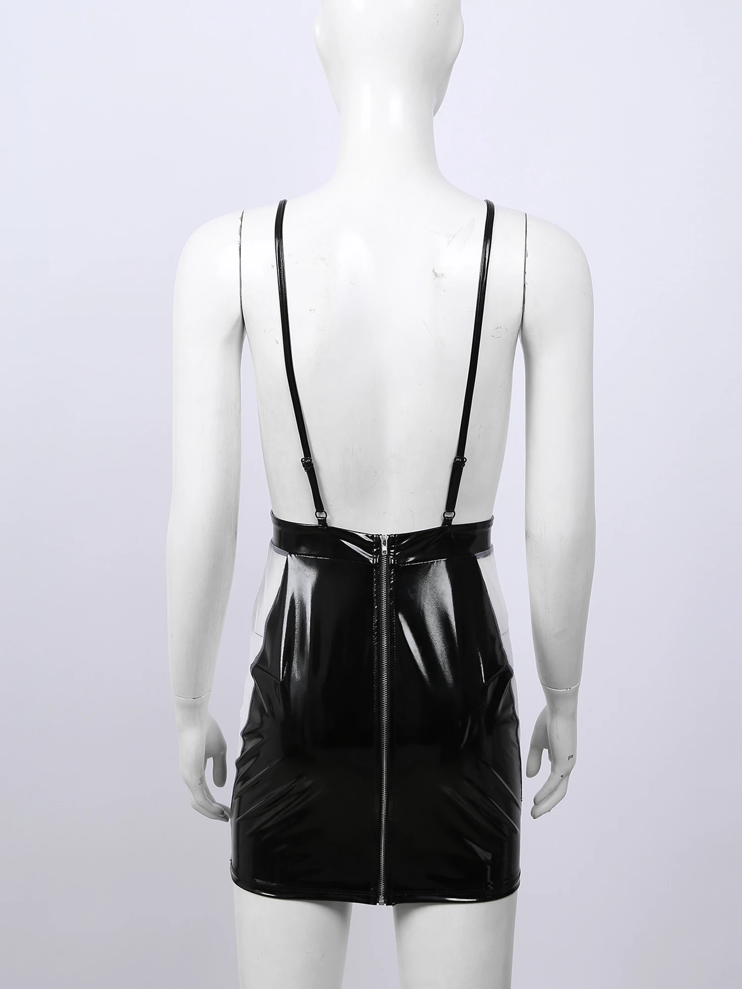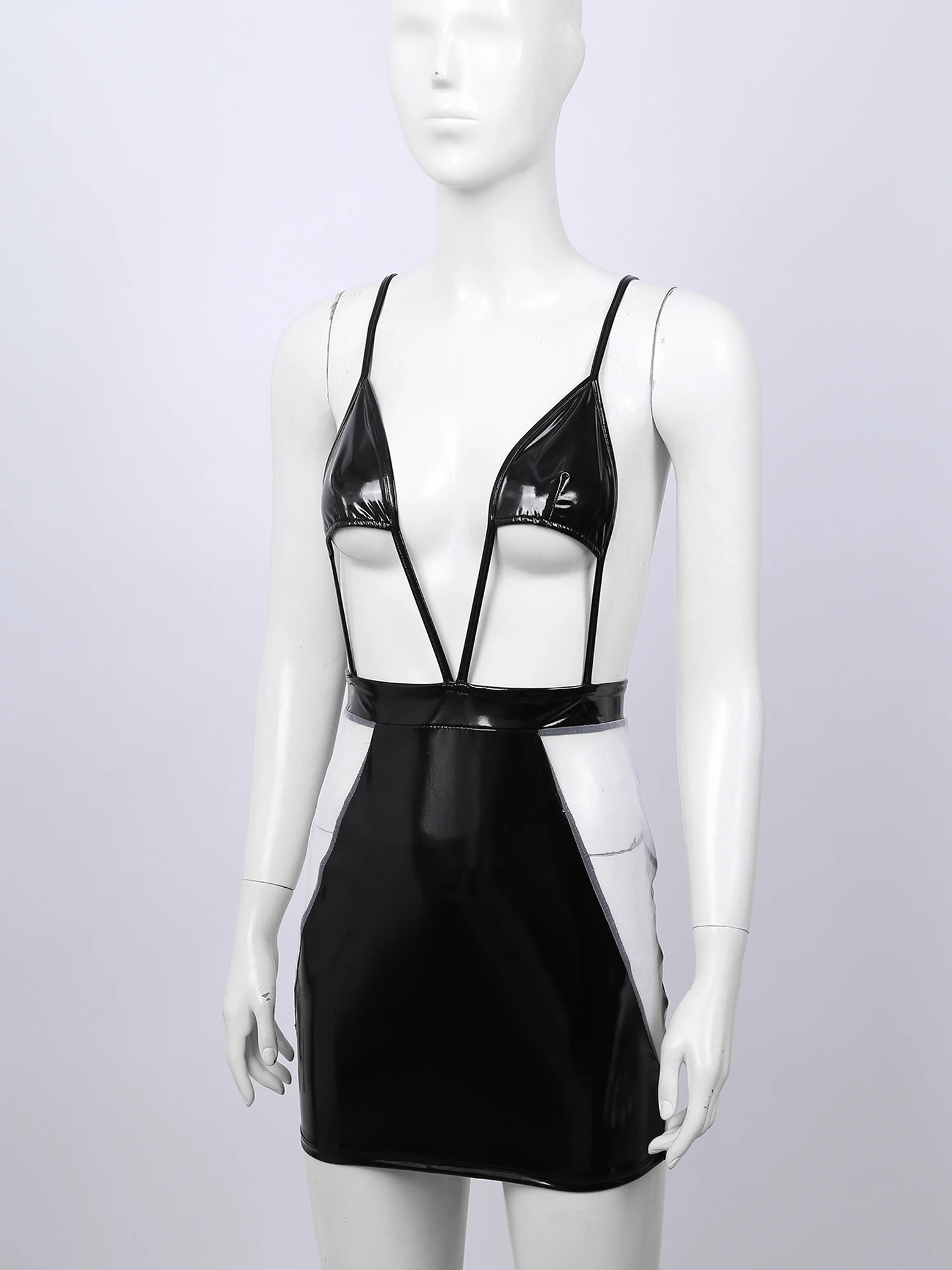 Сексуальное женское глянцевое платье из лакированной кожи с вырезом, прозрачное Сетчатое лоскутное платье с регулируемыми бретельками, кл...