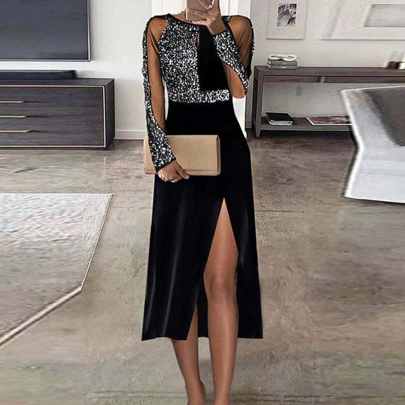 Сексуальное женское прозрачное Сетчатое платье с вырезами, женское элегантное модное длинное вечернее платье с блестками и разрезом, лоску...