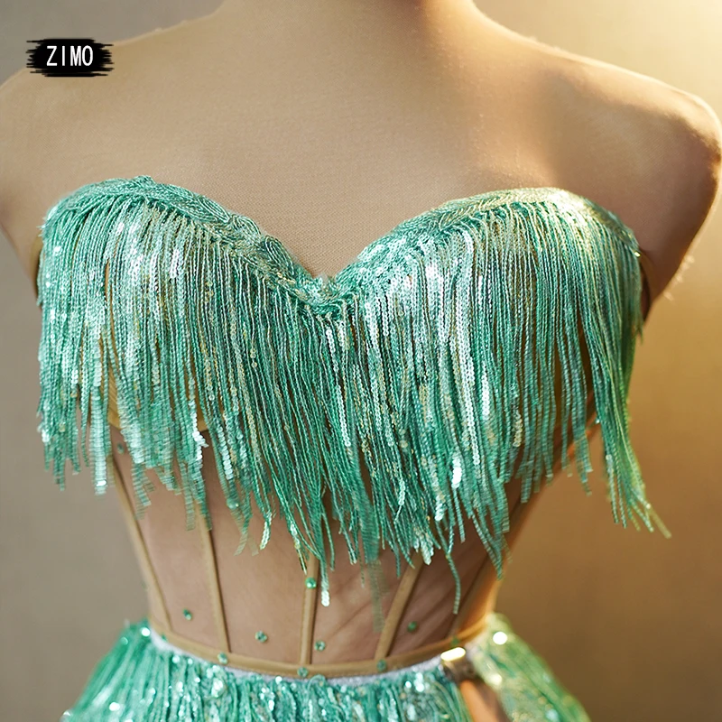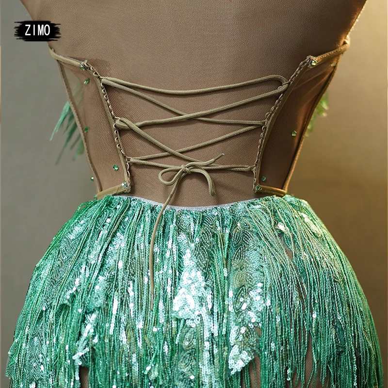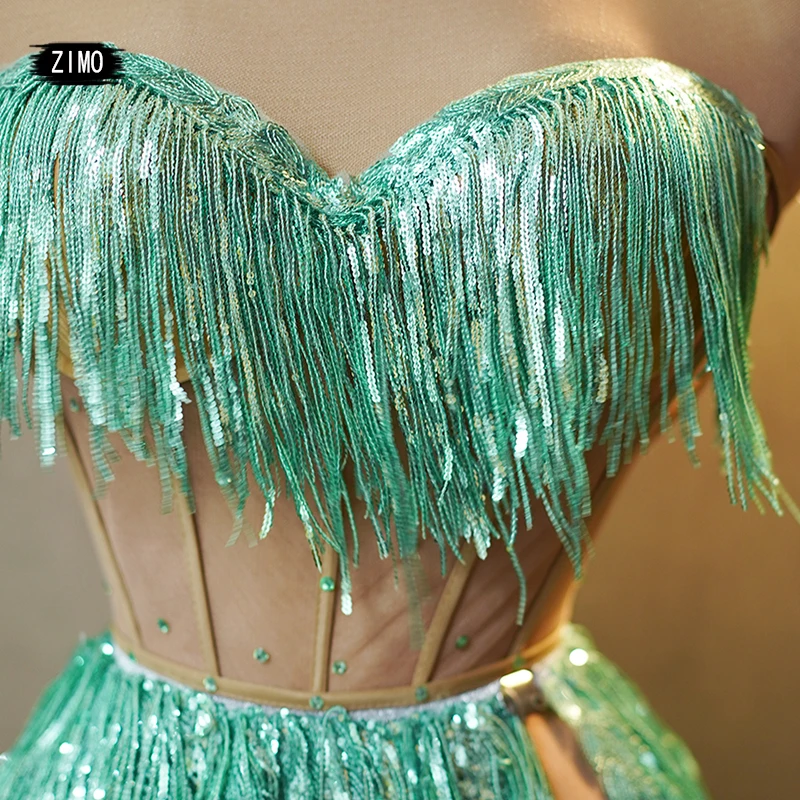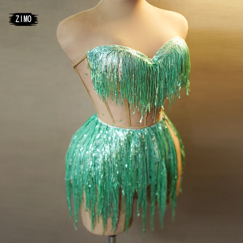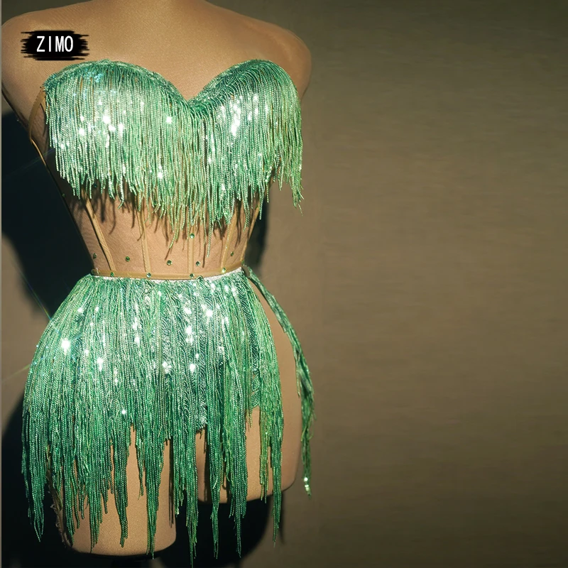 Сексуальное модное сценическое платье, женское платье из 2 предметов, зеленые платья с кисточками и пайетками, танцевальная одежда для вечеринки, дня рождения, костюм Drag Queen