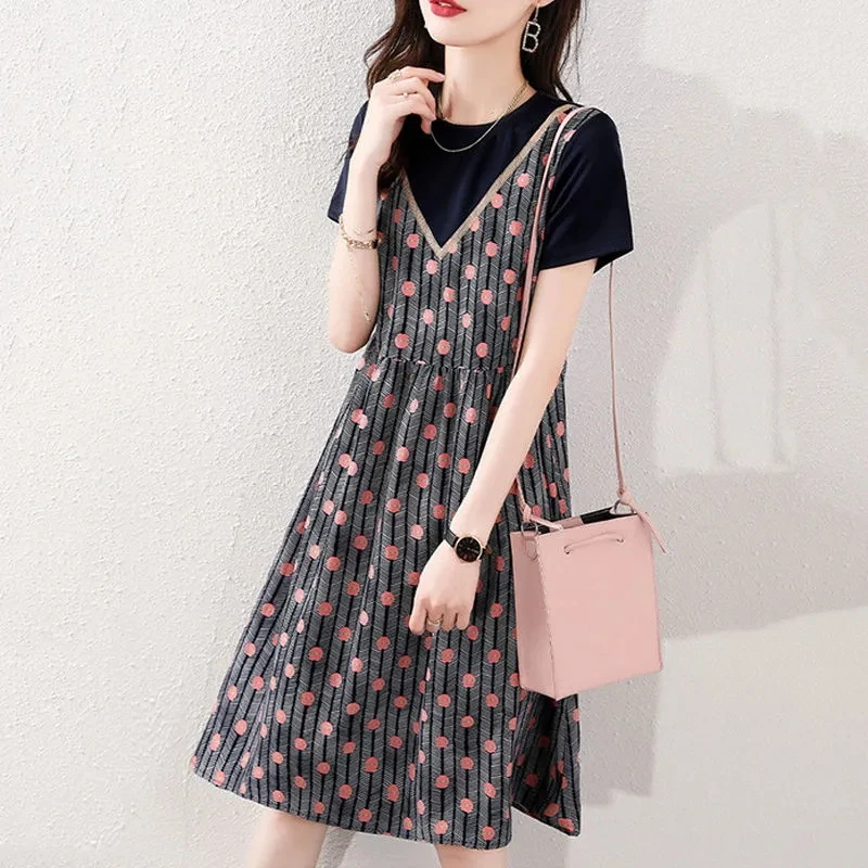 Женское платье в стиле пэчворк с круглым вырезом, Новинка лета 2022, женское Новое винтажное платье из 2 частей, одежда до колена в горошек с фр...