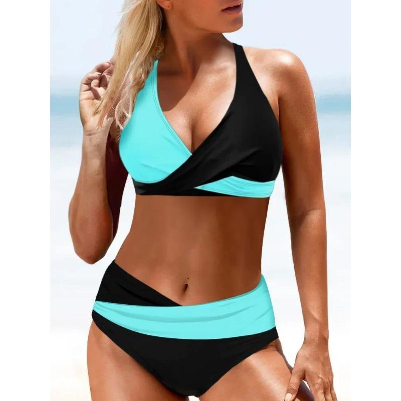 Сексуальные облегающие бикини без спинки, комплект из 2 предметов, женский раздельный купальник с высокой талией, пляжный стиль, блочные бикини 2025, новый летний комплект бикини XL озеро синий