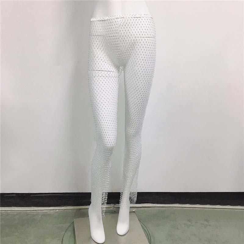 Сексуальные сетчатые брюки с разрезом и отделкой стразами, эластичные облегающие брюки, трендовые повседневные длинные брюки для стильного наряда, идеально подходящие для вечеринок S белый