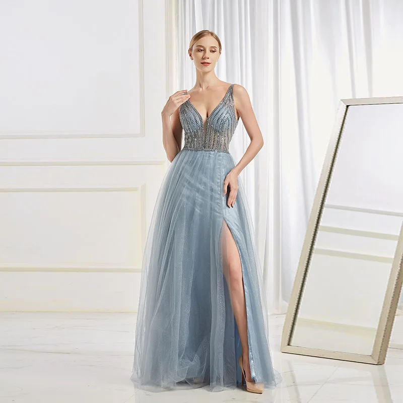 Сексуальные синие Длинные Выпускные платья из бисера с V-образным вырезом из тюля с блестками разрезами и открытой спиной вечернее платье д...
