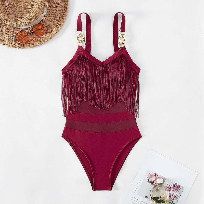 Сексуальный цельный купальник, женский купальник с высокой талией и кисточкой, металлический плечевой ремень, купальник-бикини, пляжная одежда S красный