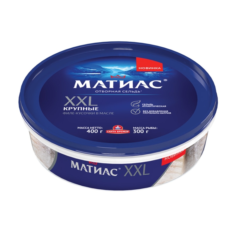 Сельдь атлантическая филе-кусочки Санта Бремор слабосоленые "Матиас" "XXL отборный" в масле 400 г, Беларусь
