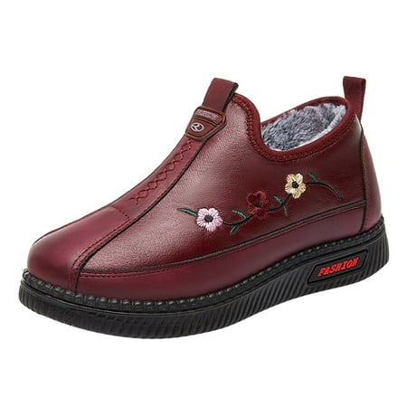 Women Walking Shoes Fashion Autumn Women Snow Boots Embroidered Flat Soft Bottom Non Slip Waterproof Slip On Warm And Comfortable Snow Boots for Women Artificial leather Red