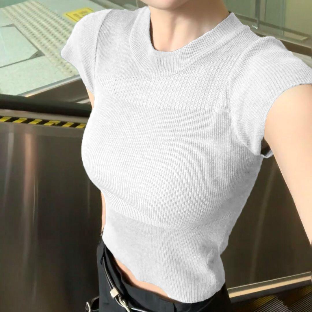 Серая вязаная футболка с вырезами на плечах - Женская летняя 2025 модная модель с коротким рукавом L белый